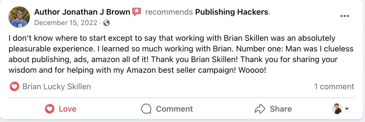 Weekly Coaching Calls with award-winning author Brian John Skillen and the Publishing Hackers team to help guide you through the self-publishing process and help you get your book out into the world with a group of authors! ($997 Estimated Value)